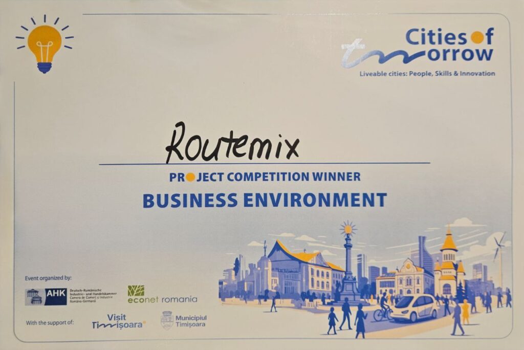 The next day, we joined Cities of Tomorrow organized by AHK Romania one of Romania’s most important business and urban innovation events. Competing among so many inspiring companies, we were honored to win the Business Sector category, a recognition that confirms our belief that smarter mobility can be built locally and scaled across Europe. It was a real pleasure meeting Mr. Lazăr Emanuel-Constantin, General Director of the Sibiu Municipality, and discussing the opportunity to implement RouteMix as an integrated smart mobility solution in Sibiu!